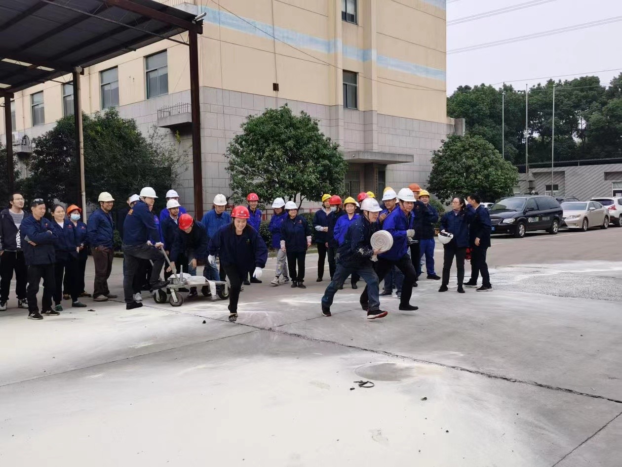 比賽分為:三十米干粉滅火器滅火、五十米消防水帶拋接,二個項目的消防演練競賽。本次競賽以各車間、辦公樓為單位,共組成10個參賽隊伍(每隊2男1女),和裁判組、服務組,大家都熱情高漲。
